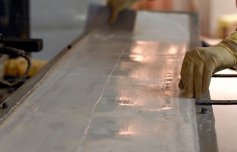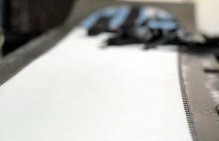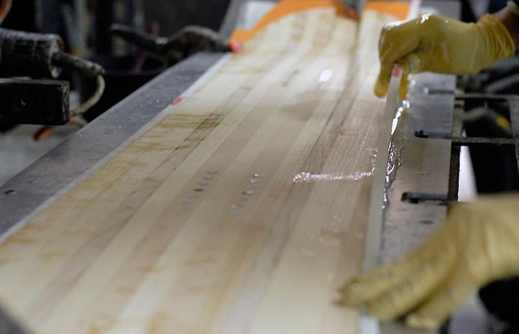 This is where it all comes together for the first time. By hand, quality made woodcores, high quality materials, and craftsmanship are assembled into a laser aligned precision-machined mold. We measure our resin for each and every ski and snowboard we make. This cuts down on wasted resin, applying the correct amount each time. Better for the environment while providing more accurate consistencies in the manufacturing process. Our laser alignment system provides consistent placement of topsheet graphics within millimeters.